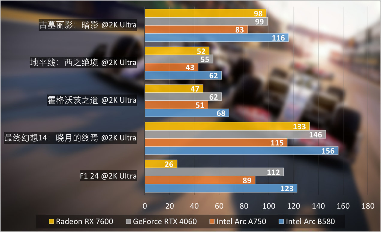 可以看到,Intel Arc B580 Limited Edition表现更猛了,相对Intel Arc A750平均性能提升31%左右,相对GeForce RTX 4060领先有11%,同样,相对AMD Radeon RX 7600领先从10%到50%不等,部分原因可能是驱动稳定性造成,比如《F1 24》中,AMD Radeon RX 7600性能没有释放出来。