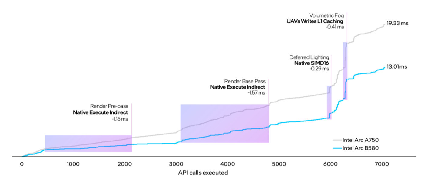 英特尔用《堡垒之夜》举例,得益于在已经上对间接执行(Execute Indirect)支持,并通过SIMD16减少光照通道执行时间,以及L1缓存无序访问视图(Unordered Access Views,UAVs)写入,同样场景下Xe2渲染体积雾的时间减少33%。
