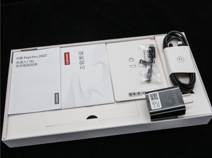 除了不用看的说明书和保修卡,小新Pad Pro包装内还送了一个30W的快充插头,一条C To C的快充线,还有一个C to 3.5的音频转接线。