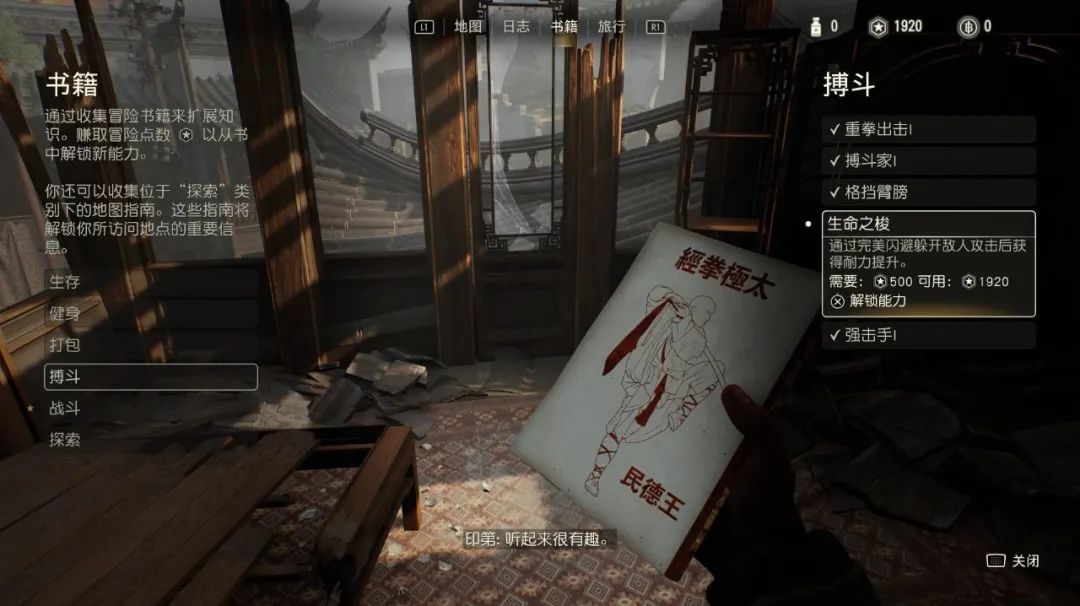而冒险书籍就是琼斯博士的“技能书”。每本书都提供一项被动技能升级,比如提升武器耐久度或增加携带物品数量等。也有一些强大的被动特效,例如闪避敌人攻击后可恢复精力条,