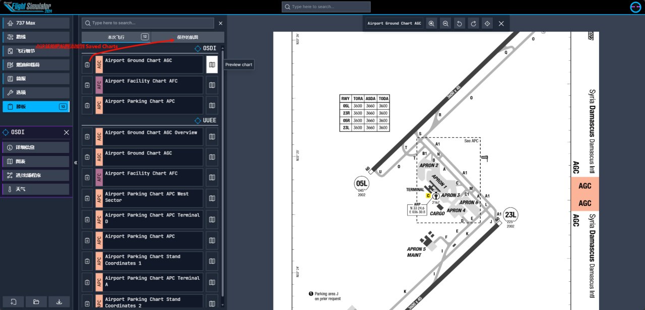 选择好机场后就可以在膝板这里查看两个机场的航图了,底下紫色分区的Chart(第二个)也可以查看选中的机场航图