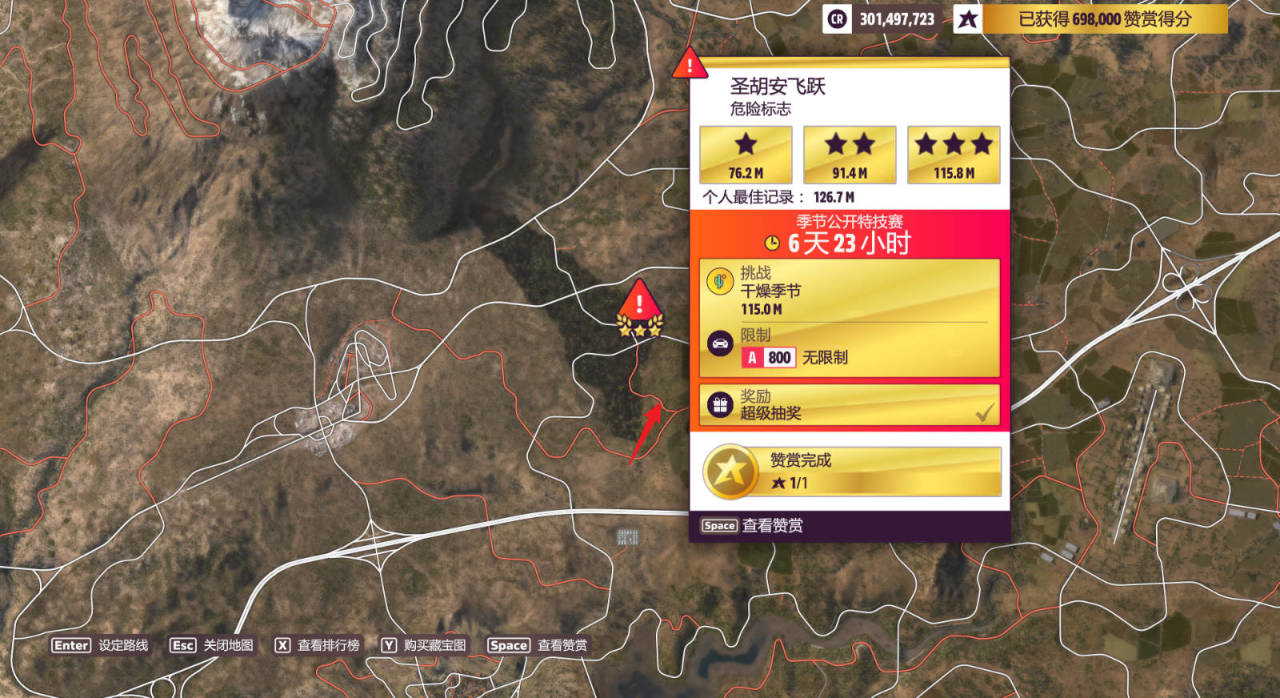 危险标志:圣胡安飞跃,完成奖励为超级抽奖。(建议从箭头所指处出发,很简单)