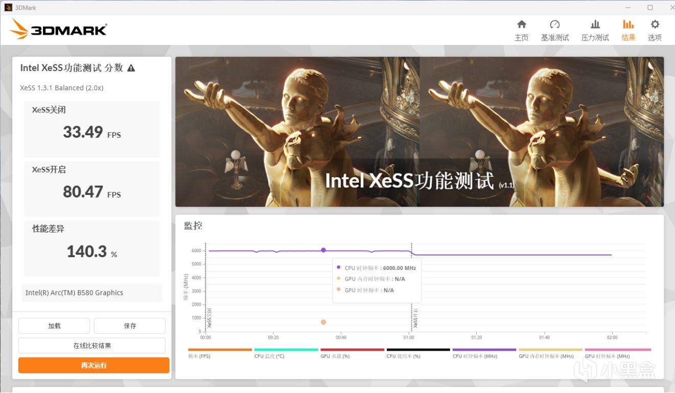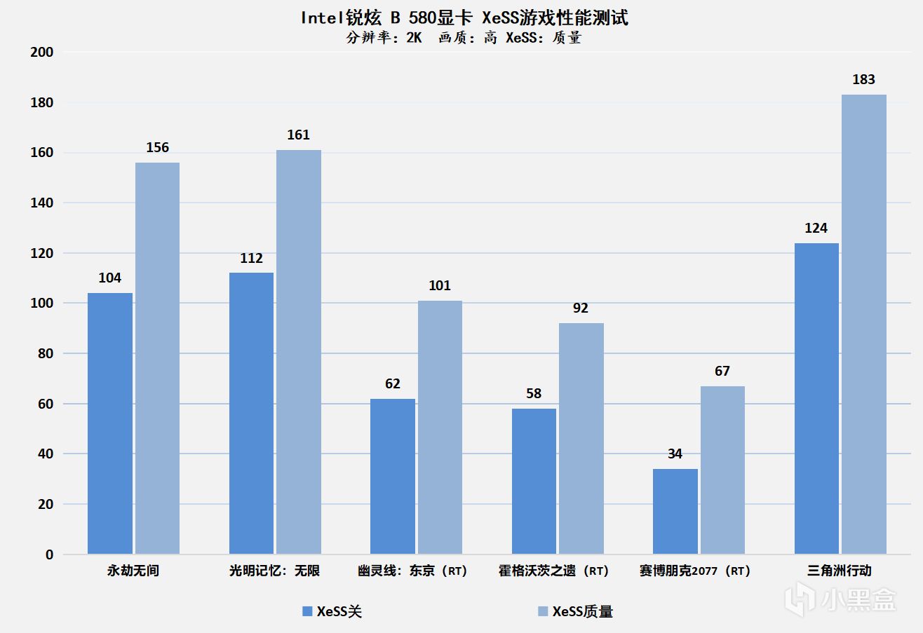 我們都知道《賽博朋客2077》的光線追蹤是壓力非常大的,在2K下開啓光線追蹤高後,B580的幀數來到了34FPS,明顯是不能流暢遊玩的,但是XeSS 1.3質量模式的加持下,幀數終於是達到了60FPS以上!從不能遊玩到流暢遊玩,XeSS的功勞非常顯著。