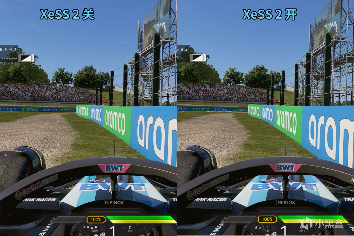 最後來看看XeSS 2的畫質情況,對比開關XeSS 2,我們沒有發現XeSS 2造成了模糊不清的問題,賽車車身的劃痕噴漆等細節都得到了很好的保留,輪胎上面的雜草等微小的細節也很好的呈現了,遠景的廣告牌和人物也沒有出現失真和模糊一團的情況,所以說在幀數大幅度提升之後,畫面並沒有出現損失,這是一個非常振奮人心的消息。