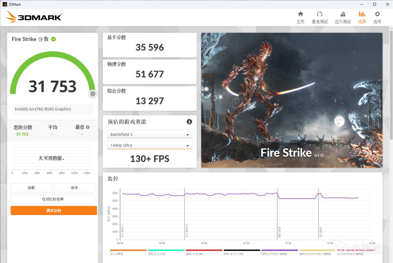 再來看看代表着DX 11渲染的Firestrike測試,在這個項目中,我們的B580顯卡成績同樣優秀,取得了35596分的高水平分數,FSE和FSU分別爲15640和7696分,同樣遠遠高於競爭對手RTX 4060Ti!