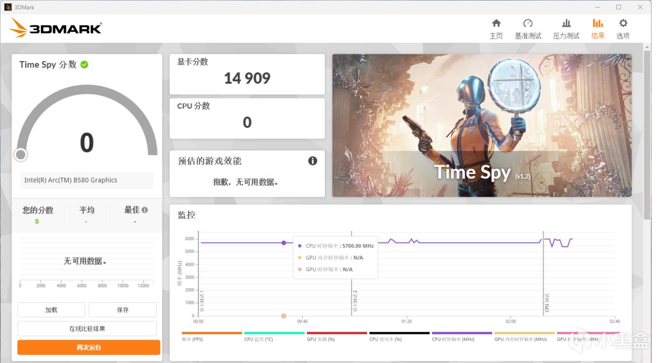 打開3D Mark,我們進行了B580的基準性能測試,先用DX 12渲染的Timespy測試開始,我們看到B580顯卡的DX 12理論分數達到了14909分!這個分數已經超過了對手RTX 4060Ti的13000分,性能十分理想!