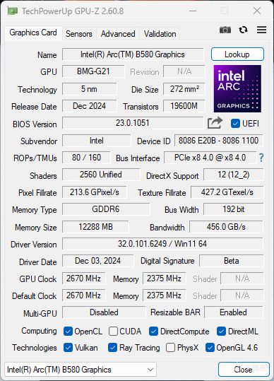 銳炫B580顯卡在規格方面也是作出了全新的升級,它採用了TSMC N5工藝打造而成,擁有20個Xe2核心,20個光線追蹤單元,160個XXM AI引擎,由於架構的升級,XE2核心被分爲了5個切片,所以也同時擁有5個渲染切片,得益於工藝製程的進步,銳炫 B580顯卡的頻率相較於前代大幅度提升,頻率可達2670MHz,在顯存方面,銳炫 B580同樣做到了加量,配備了192bit位寬的12GB GDDR6顯存,顯存帶寬高達456GB/S,算力可達233TOPs。