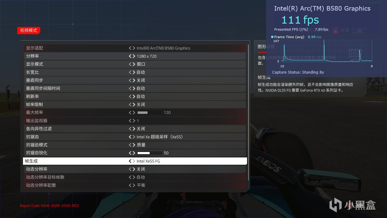 目前《F1 24》已經支持了XeSS 2技術,我們打開XeSS 2的各項功能,可以從幀率、畫面、延遲這三個方面來考察XeSS 2的效果。