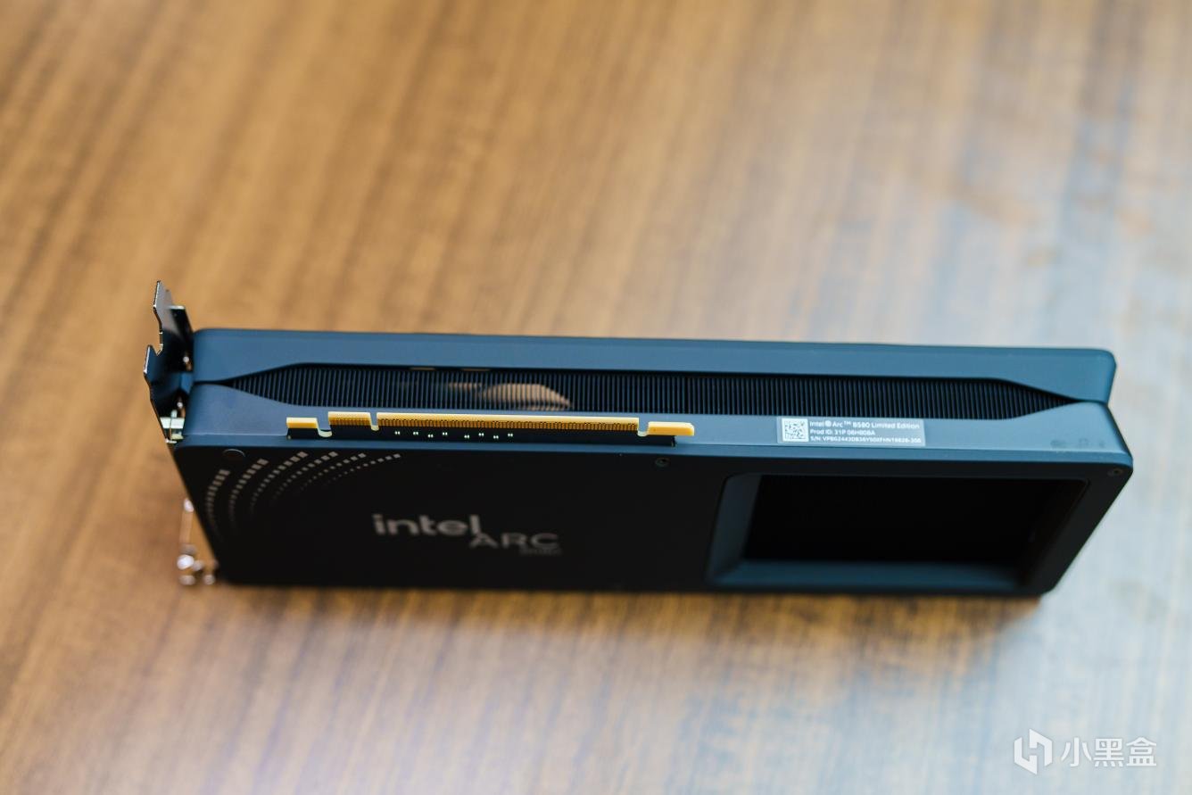 顯卡的背面做了開窗的設計,大面積的散熱片直接暴漏在空氣中,這樣有利於散熱效率的提升,使得熱氣更加迅速的排出,而左邊則是印有Intel B580的LOGO。