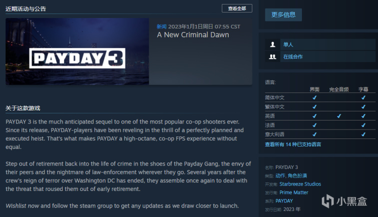 2023年的第一天,沒想到等到了《收穫日3》即將發售的好消息。就在今天早上,《收穫日3》的STEAM商店頁面已經上線了,官方同時上線了一段約半分鐘的預熱片段。在這則預告片中,玩家驚喜的發現了該作的全新LOGO。官方在這則宣傳片中明確標註“THIS IS THE YEAR OF PAYDAY3"(暗示今年發售),這等於對玩家注入了強心針,表示該作今年不會再跳票了。遊戲的具體遊戲配置暫時未公開,該作支持簡體中文。遊戲預計將於今於今年第二季度發售,同時登錄PC和主機平臺。