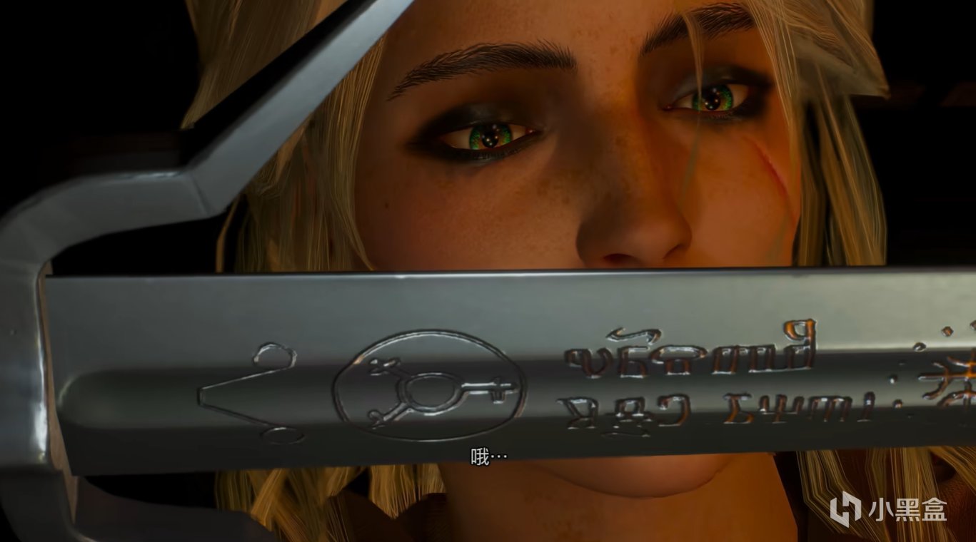 另一側,一位獵魔人(希裏)在冥想,她抽出獵魔人的銀劍打磨鋒利。