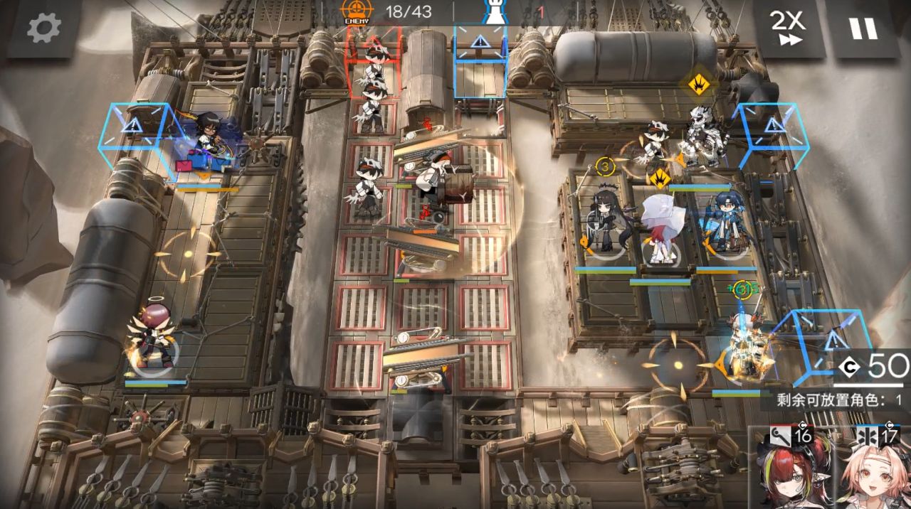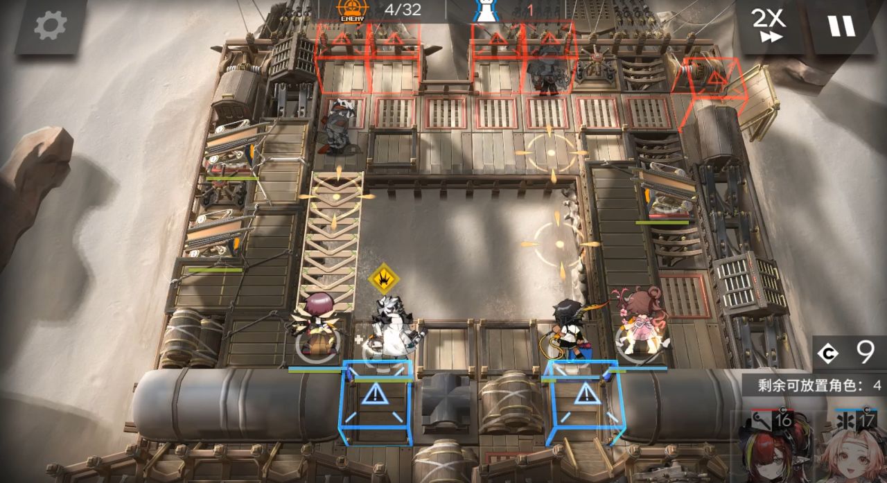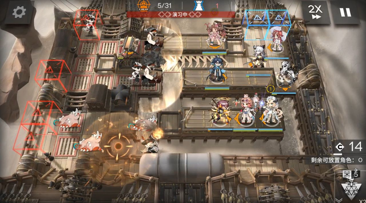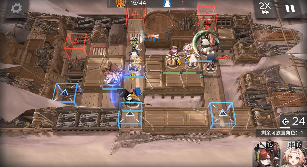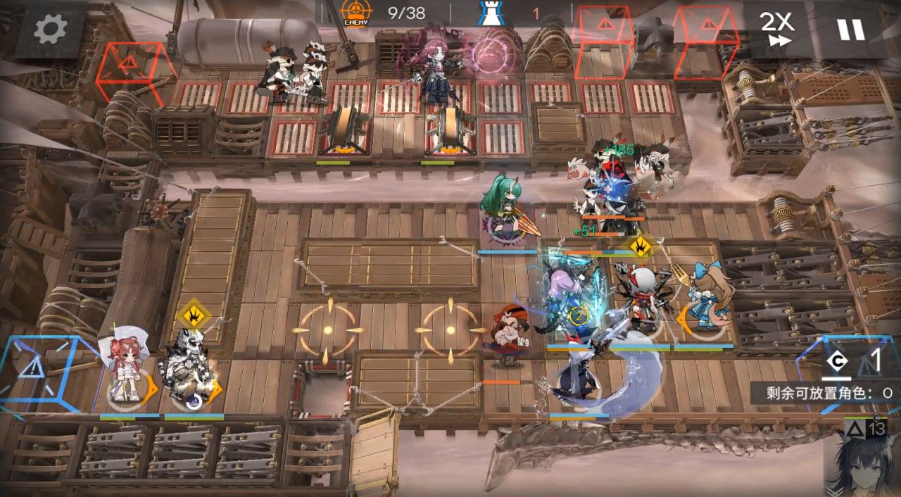 開局依次部署2先鋒,處理掉2個造橋的怪(下圖左邊斷掉甲板處),然後撤退風笛,部署拉普朝左,月見夜朝右,棘刺朝左,芳汀朝右,撤退桃金娘。之後數5個怪沉入鹽中,不是打死,對面會身體慢慢下沉然後血直接歸0。之後再放小羊朝上掛機。