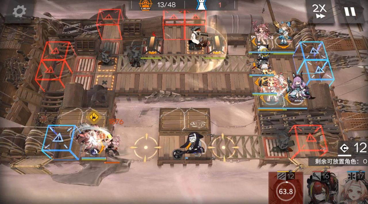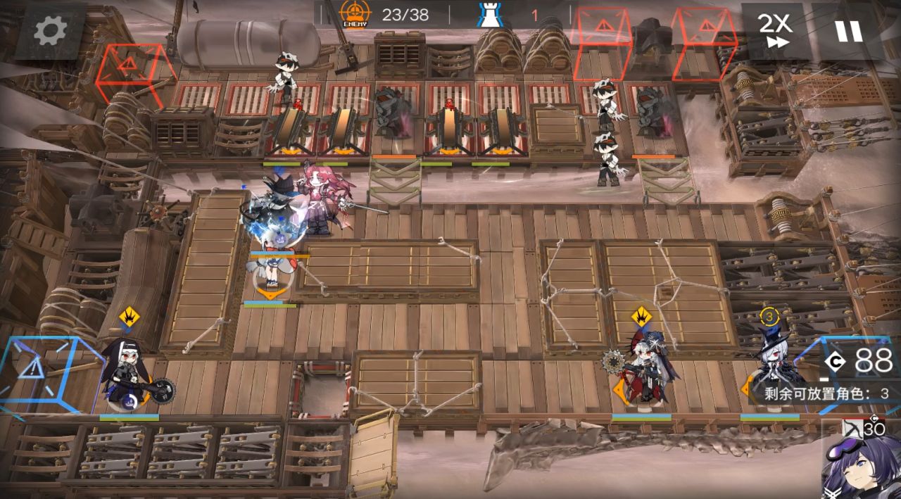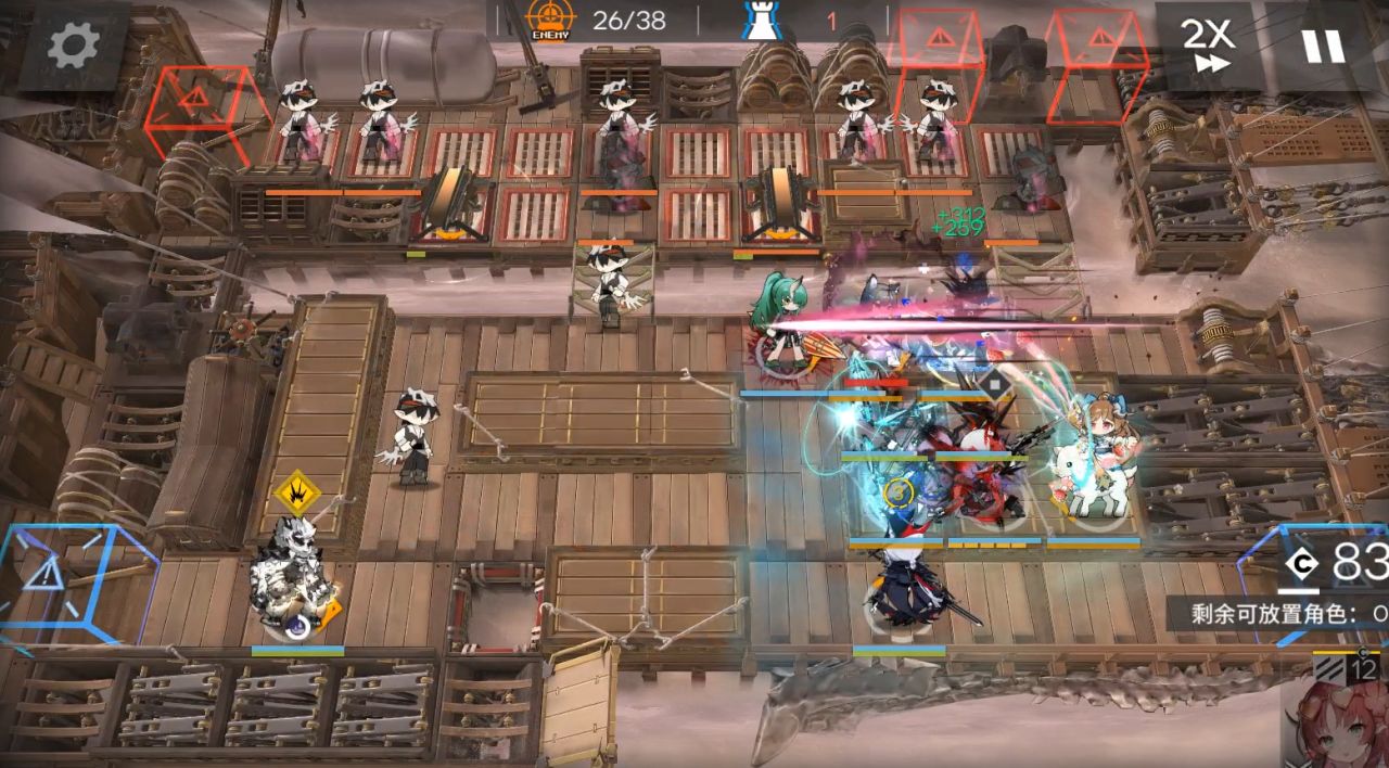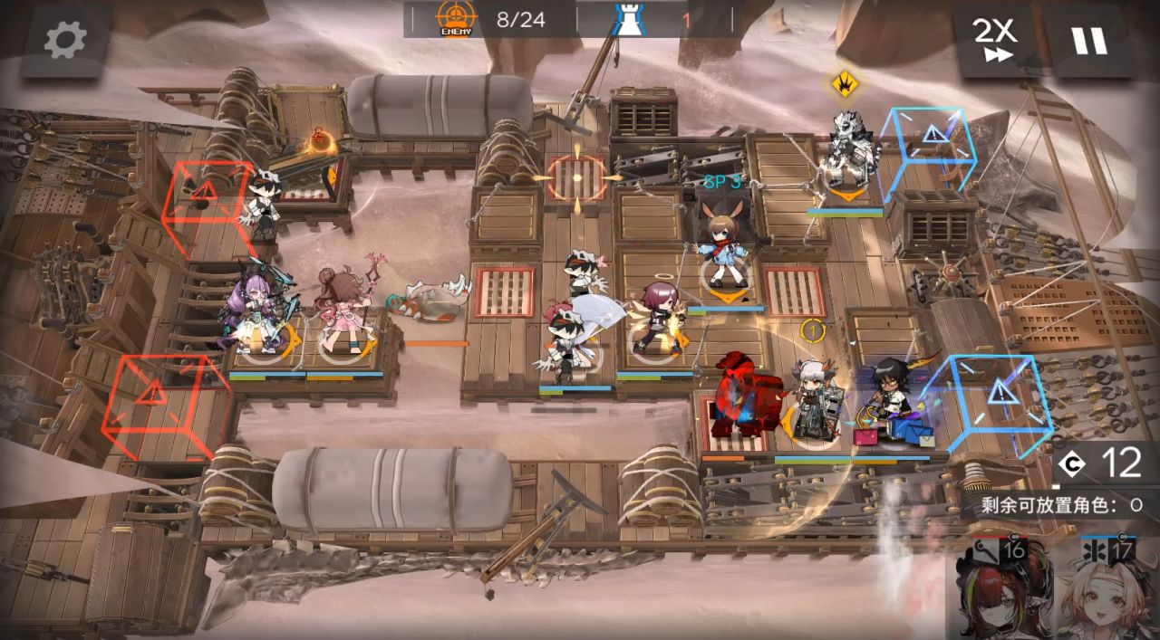 開局依次部署2先鋒,處理掉2個造橋的怪(下圖左邊斷掉甲板處),然後撤退風笛,部署拉普朝左,月見夜朝右,棘刺朝左,芳汀朝右,撤退桃金娘。之後數5個怪沉入鹽中,不是打死,對面會身體慢慢下沉然後血直接歸0。之後再放小羊朝上掛機。