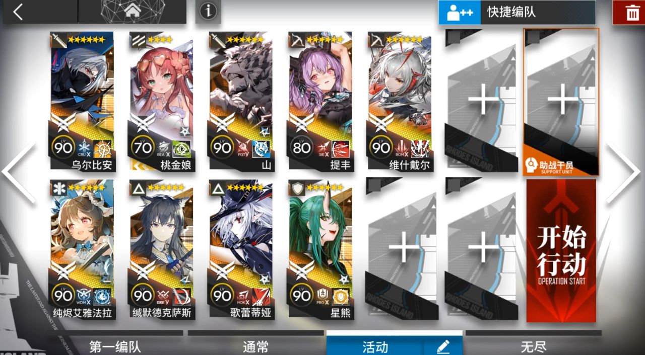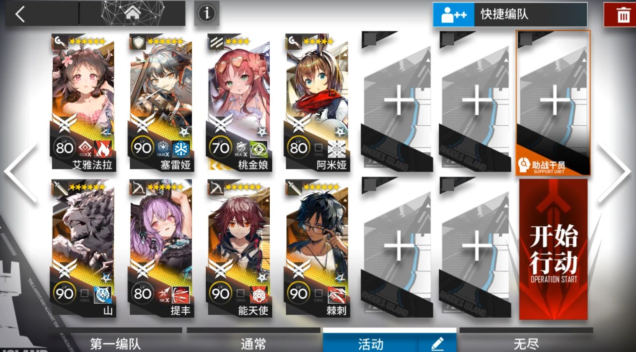 普通可拿蝕刻章,陣容通用。月見夜和芳汀可換任意能平a一下鳥觸發加速的幹員,不需要練度,也不會被打。棘刺和拉普可換地面幹員,但推薦多帶個狙擊對空。