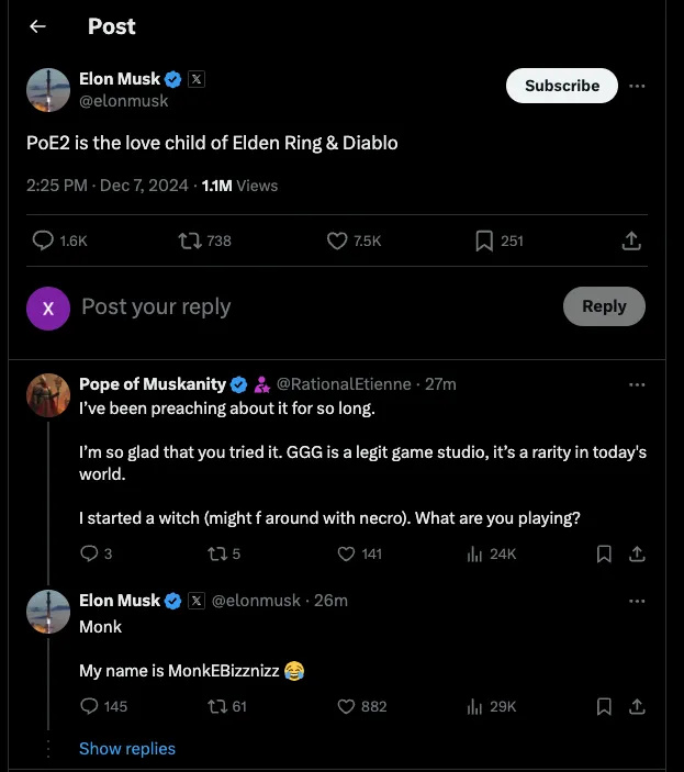就拿Steam熱銷榜來說,近期《三角洲行動》《漫威爭鋒》都拿到了不錯的成績,而騰訊的《流放之路2》更是號稱年末最後的大黑馬,Steam最高同時在線峯值接近58萬人,衝進歷史Top15,並在熱銷榜Top1的位置上呆了五天。就連埃隆·馬斯克都是第一時間遊玩,並表示該遊戲是“艾爾登法環+暗黑的結晶”。