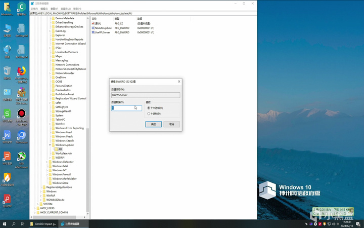 然後進入HKEY_LOCAL_MACHINE\SOFTWARE\Policies\Microsoft\Windows\WindowsUpdate\AU,其中UseWUServer默認值爲1,改成0