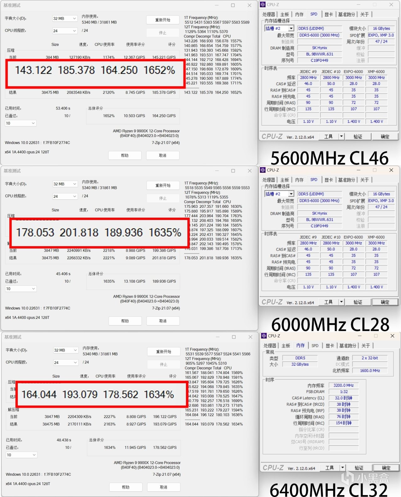 實測在5600MHz頻率下對比6000MHz的分數,可以看到整體壓縮得分從143.122提升到178.053,提升24.4%;解壓縮得分185.378提升到201.818,提升8.86%,總分從164.250提升到189.936,提升15.63%。可見當內存頻率提升後,在日常文件解壓中也會提升日常工作效率。