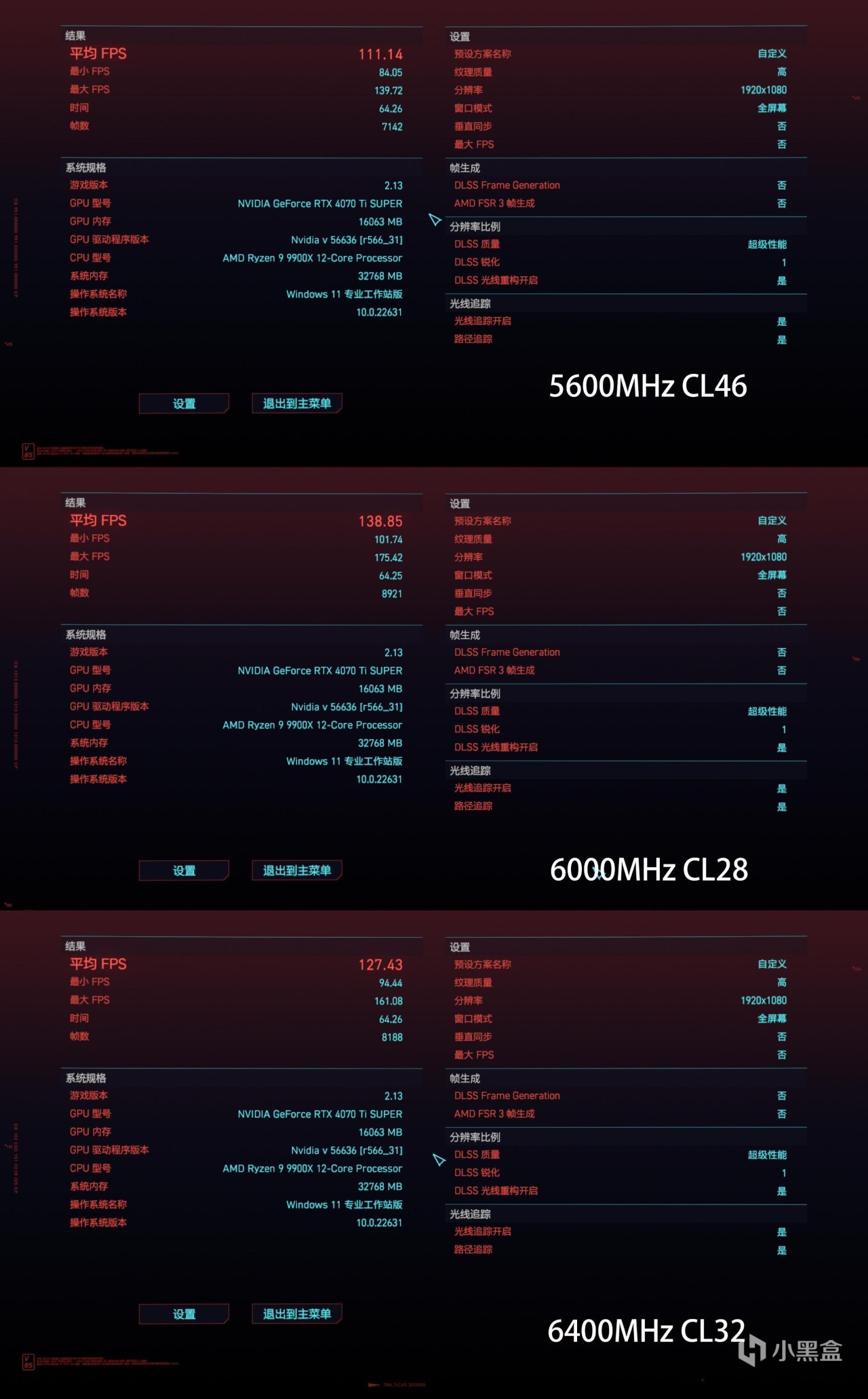 遊戲測試中,選擇了「2077」這款遊戲在相同的參數下對比遊戲幀數。可以看到在5600MHz內存頻率下,遊戲平均FPS:111.14,最小FPS爲84.05;在內存頻率爲6000MHz CL28時遊戲平均幀數138.85,最小FPS 101.74;整體不論是平均幀數或者最低幀數都有不小的提升,平均幀數提升了25%,最小幀數提升了17幀。