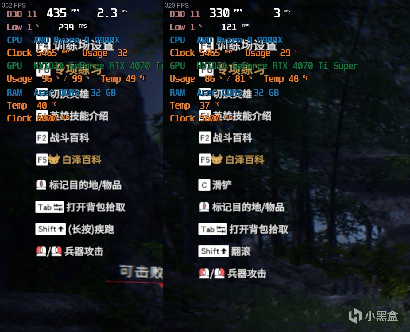 另外在網遊「永劫無間」遊戲中的練習場模式下,可以看到對比5600MHz默認與6000MHz CL28兩個頻率下的對比,5600MHz頻率下游戲平均幀數330,1% Low幀 121幀;在一鍵開啓AMD E.X.P.O 內存超頻後6000MHz CL28時序下游戲平均幀數來到了435幀,1% Low幀 239幀。實際提升了大約31.8%,最低幀也提升了118幀。