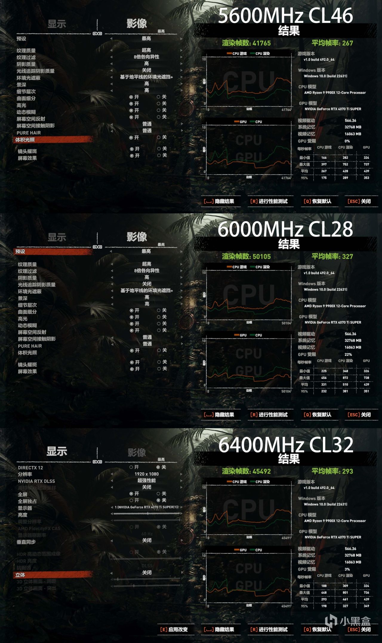 同樣在「古墓麗影:暗影」遊戲中測試5600MHz頻率下游戲平均幀數267,在一鍵開啓AMD E.X.P.O 內存超頻後6000MHz CL28時序下游戲平均幀數來到了327幀。實際提升了大約22.4%,而在6400MHz CL32頻率下游戲平均幀數相比默認5600MHz時有提升,但是整體幀數表現依舊與之前測試「2077」遊戲中表現類似。可以見更低時序的6000MHz內存會對遊戲幀數以及1% Low幀有明顯的影響,玩家會從中獲得不少遊戲幀數提升。