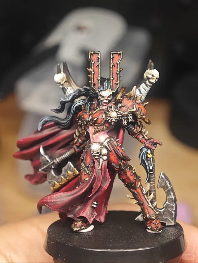 长大后的她,架空了自己部落那爱好和平,主张秩序的酋长父亲和莽夫愚笨的丈夫,自立为王。后来某位色孽神使找到她,希望能与她繁衍后代,共创未来。但是瓦尔基娅已经信奉了恐虐,对色孽毫无兴趣😂在用诱惑与武力双管齐下,砍掉了神使的头颅,并做成了盾牌(难怪那盾牌有个鬼脸😝)。