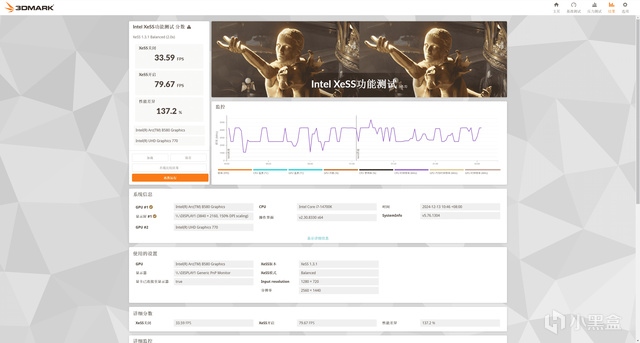 咱们实测使用3Dmark里面的Intel XeSS功能测试:关闭XeSS,帧数为33.59,开启XeSS帧数为79.67帧,性能相差137%,性能提升到2倍还多!