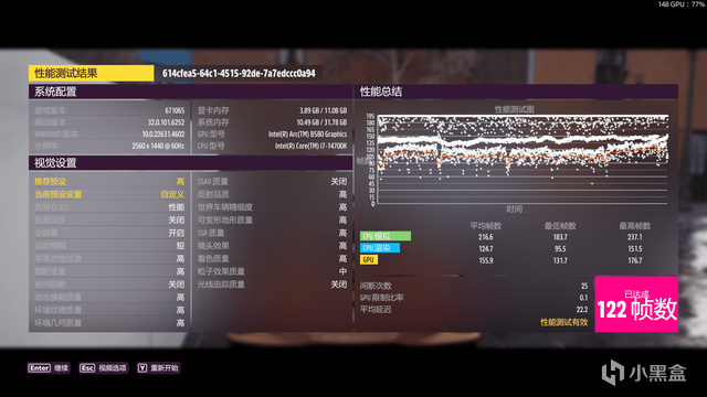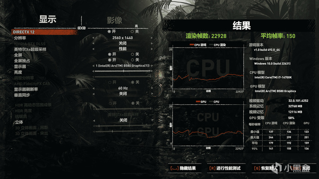 紧接着是古墓丽影的测试情况,古墓丽影也是支持英特尔XeSS超采样的,所以提升幅度极高,同样是2K分辨率、高画质下,平均帧率可以达到150帧。