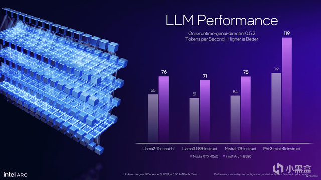 非常值得一提的是,B580 Photon显卡搭载了第二代 XMX AI引擎,利用 AI 推理能以极快速度实现本地计算性能。在Llama 2、Llama 3.1和Phi-3等大型语言模型时,相比RTX 4060,Intel Arc B580都是遥遥领先,最大性能一度领先30%以上。