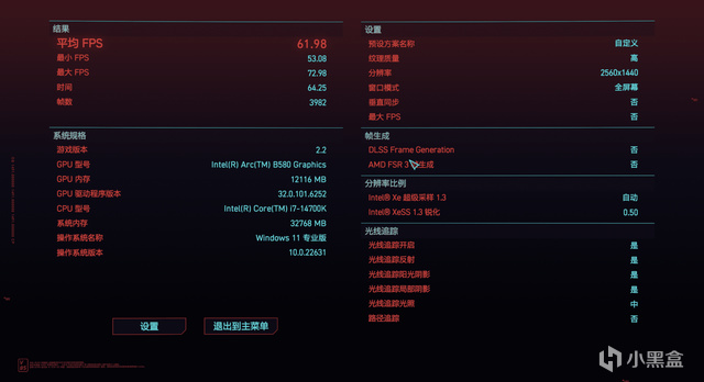 接下来开启光追,光追光照质量为中,其余光追设置为高,同样是2K分辨率高画质,B580 Photon显卡拿到了61.98的帧率,即使开启光追也能流畅玩。