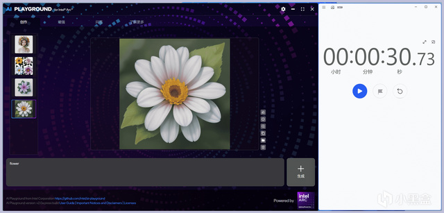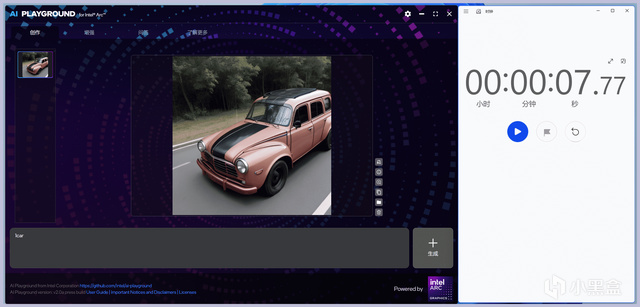 此外。英特尔也出了AI工具,叫做AI PLAYGROUND,实测生成一张汽车的图片,选择512*512分辨率,标准质量,步数20,只需要7秒钟。