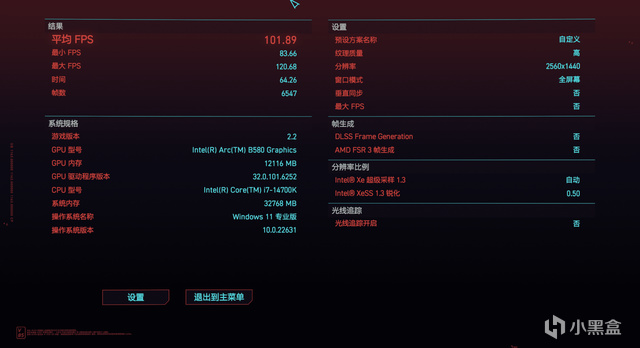 B580 Photon显卡在赛博朋克2077的测试中,开启XeSS超采样,拿到了101帧率的成绩,可谓是非常不错,采用的2K分辨率、高画质,关闭光追。