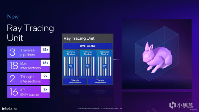 另外在光追方面,英特尔也做了升级,新一代光线追踪单元 (RTU) 提供高达 2 倍吞吐量,加速游戏逼真视觉与光影效果;
