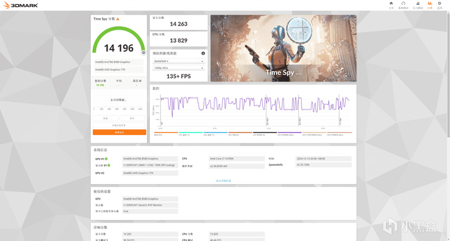 首先是TimeSpy的跑分,显卡得分14196。Time Spy的基准测试包括两个图形测试和一个CPU测试,分别展示了DirectX 12在不同方面的优势。图形测试使用传统的前向渲染技术,模拟了一些常见的游戏场景。图形测试使用延迟渲染技术,展示了更复杂的光照和阴影效果。CPU测试则利用多线程和异步计算来模拟高负载的游戏物理和逻辑。TimeSpy的基准测试结果由图形分数、CPU分数和总分数组成,可以与其他用户进行比较。