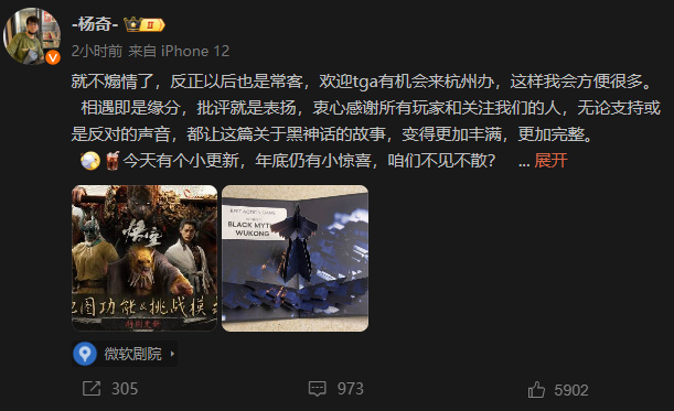 《黑神話:悟空》落選 TGA 年度遊戲後,楊奇也在微博發文表示“論支持或是反對的聲音,都讓這篇關於黑神話的故事,變得更加豐滿,更加完整”,結尾還向玩家透露“年底仍有小驚喜!”