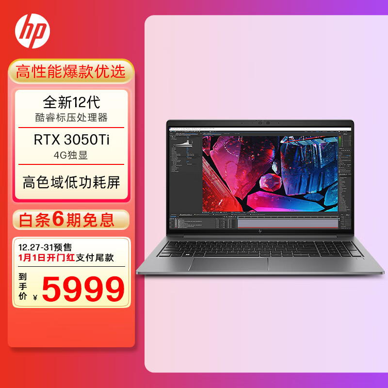 惠普在今年 6 月份推出了战 99 设计师本,搭载 12 代酷睿 i5-12500H 处理器,显卡为 RTX 3050 Ti 游戏显卡,首发 6999 元,1 月 1 日 0 点秒杀价 5999 元。