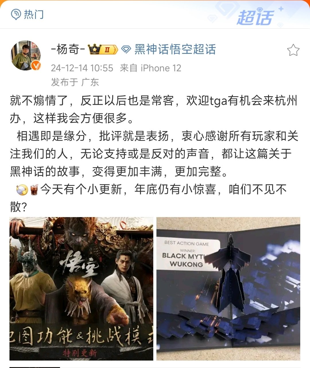 此外,2024TGA年度游戏已经全部结束,黑神话悟空美术总监杨奇在微博做了小总结,算是阴阳怪气了TGA一把,并且透露了年底还有小惊喜,大家可以期待一下(首先排除影神图实体版)