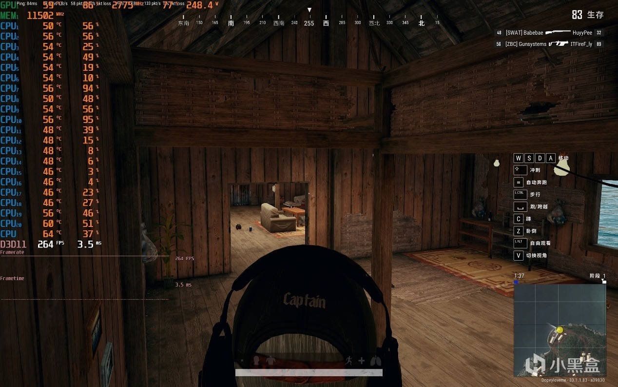 ▼室內情況,遊戲幀數也在264幀左右,不高,顯卡佔用86%,略高一點點。