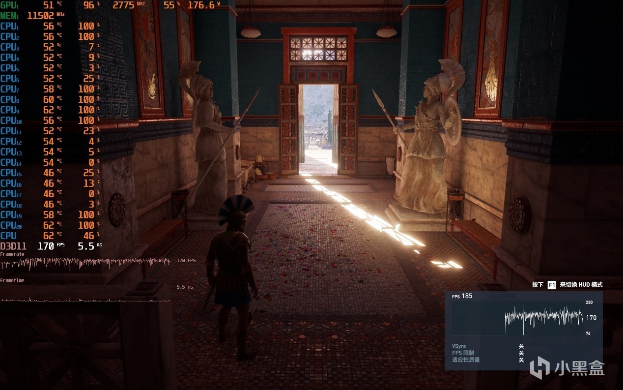 ▼衆生平等奧德賽,2K分辨率,全極高畫質,體積雲最低,走廊遊戲幀數在170幀左右,顯卡佔用96%。