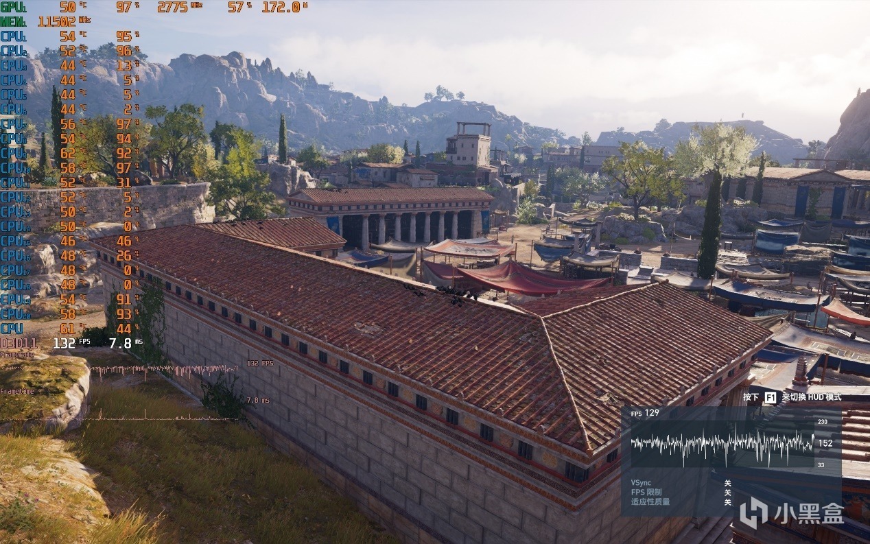 ▼室外遊戲幀數在132幀左右,顯卡佔用97%。