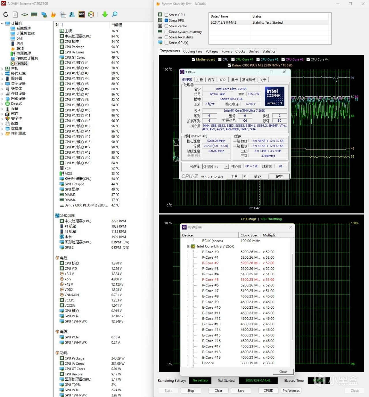 ▼單烤FPU測試,處理器功耗在240W左右,大核睿頻5.2GHz,小核睿頻4.6GHz,溫度94℃左右,處理器核心溫度相差巨大,有的核心溫度僅有64℃,有些核心溫度則有96℃,溫差巨大,後面考慮申請一個偏心扣具,試試看散熱效果。
