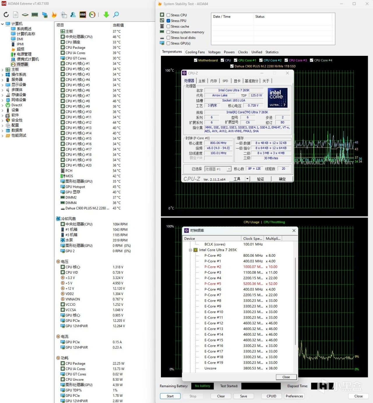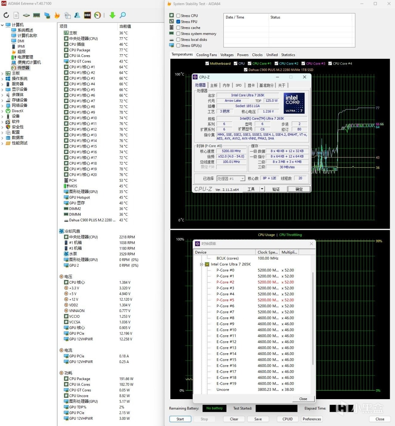 ▼簡單跑個CPU-Z的壓力測試,處理器功耗在195W左右,大核睿頻5.2GHz,小核睿頻4.6GHz,溫度在77℃左右。核心溫度相差很大,265K處理器的核心模塊並不在處理器的中心位置,很多散熱器廠家都推出了偏心扣具,讓水冷頭的壓力中心偏到一角,可以有效提高散熱效果。