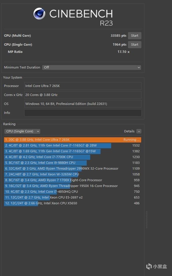 ▼跑個CineBench R23,單線程得分1964,多線程得分33585,給力。