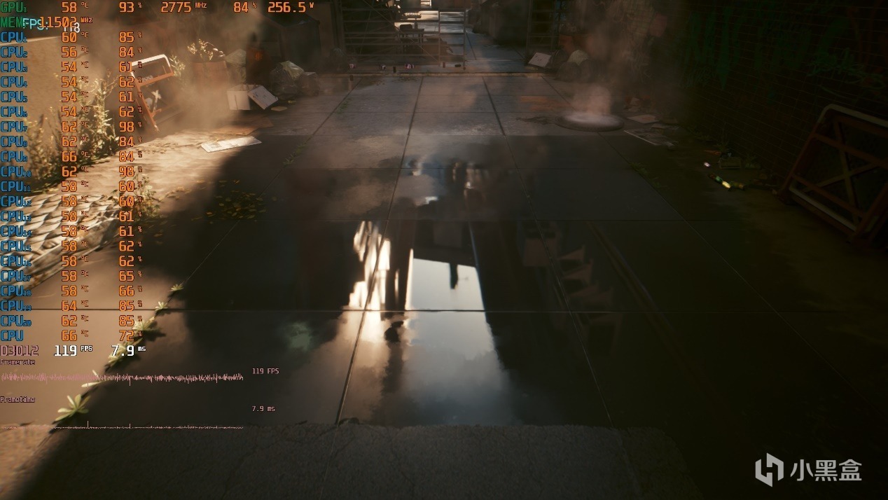 ▼室外水灘,倒影非常真實,遊戲幀數在119幀左右,表現不錯。