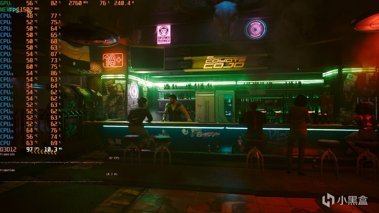 ▼酒吧的吧檯處光影效果非常震撼,遊戲幀數在97幀左右,非常流暢。