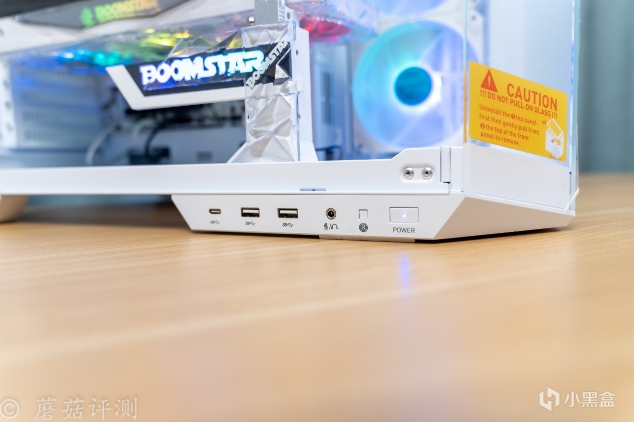 ▼機箱的IO面板放在了機箱側面的底部,除了開機鍵和重啓鍵之外,還有兩個USB 3.0接口、一個Type-C接口和3.5mm的音頻接口。這種IO接口的位置設計,更加適合那種把機箱放在桌面的情況,日常使用會更加方便。