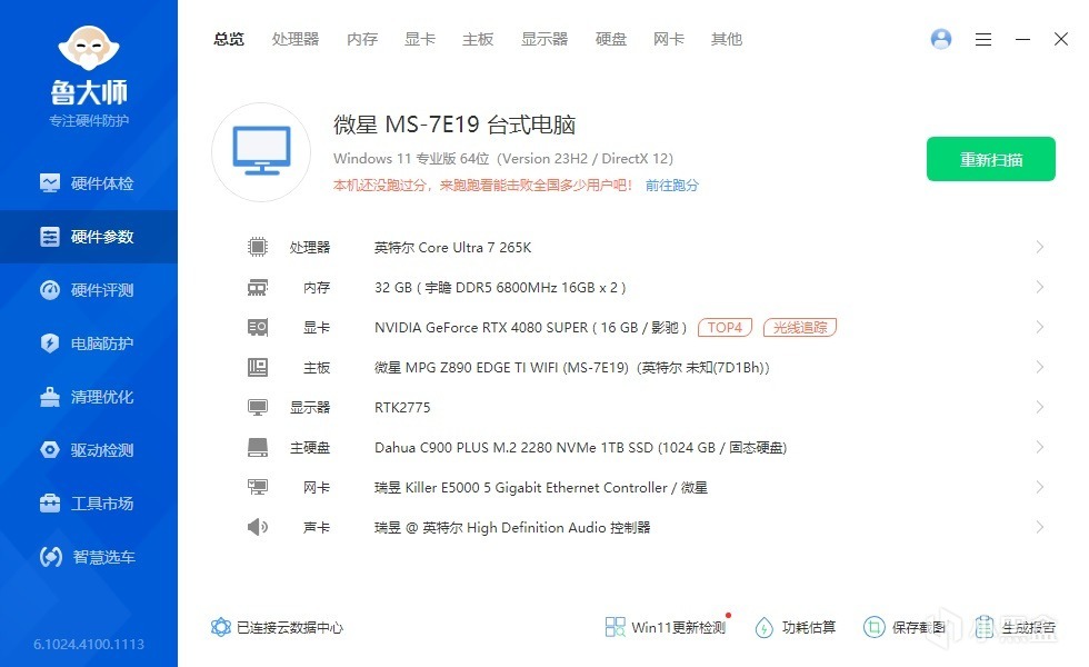 ▼整機配置一覽,處理器是265K,主板是微星的MPG Z890 EDGE TI WIFI刀鋒鈦,顯卡是影馳的RTX4080 Super星曜OC。