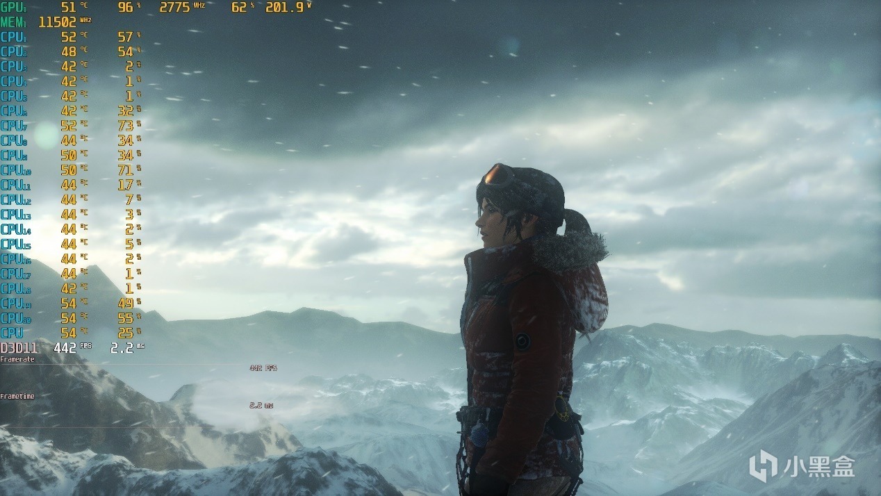 ▼古墓麗影,2K分辨率,全高畫質,第一個測試場景,遊戲幀數在442幀左右,顯卡佔用96%。