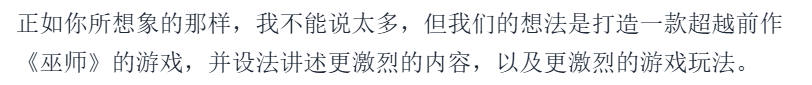 採訪整體給我的感覺,就是把2077的部分玩法,和巫師的故事和敘事統合在一起。製作人對新作的目標連續用了兩個“激烈”:講述更激烈的內容,以及更激烈的玩法。後者可能對應了玩法的高自由度,那前者可能就是暗示本次故事會更加黑暗殘酷。