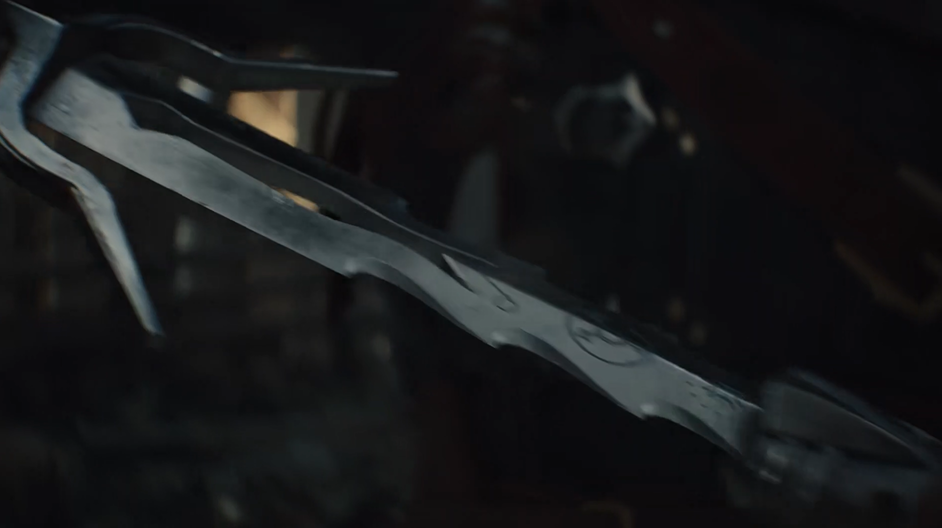 開場磨的劍,劍身鏤空並有着火焰形波浪,但從同樣V字形的劍鄂和刻印的符文可以看出,很接近結局中傑洛特贈送的那把“吉薇艾兒”銀劍。考慮到《巫師3》預告裏的傑洛特也比實機更老,希裏實機中的顏值還是可以期待一下的。