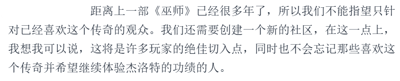 採訪中,製作人特意提到距離上一部《巫師》已經很多年,製作組不能只着重於老玩家,將爲新玩家提供“絕佳切入點”,也就是以開始新旅途的希裏作主角,讓新玩家能低門檻地遊玩,不用補習太多前作內容。對於老玩家,製作人也專門提到了“傑洛特”,也許我們能看到不少情懷老角色。
